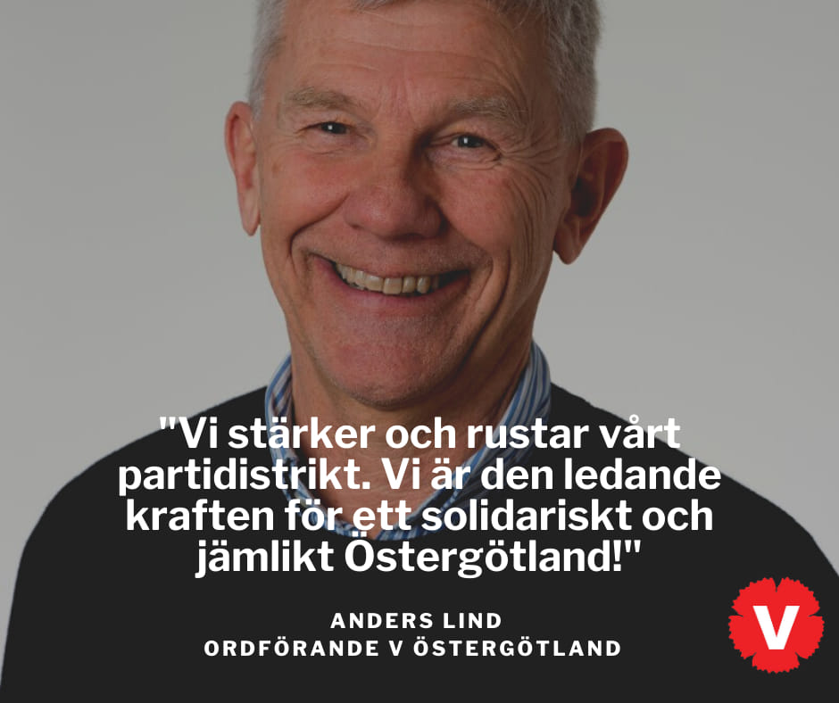 I distriktet fortsätter Anders Lindh, från Kinda, som distriktsordförande. Anders har vi ju mött som mötesordförande på våra årsmöten de senaste två åren. Han är en mogen man, 70+, vilket inte hindrar honom från att vara aktiv på många plan. Förutom i partiet är han styrelseledamot i vänstern inom kyrkan VISK, i PRO-distriktet och också inom HBTQ-rörelsen. Innan han pensionerades arbetade han bland annat som socialchef i Kinda under många år. Det känns bra att han fortsätter som distriktsordförande, tycker jag.